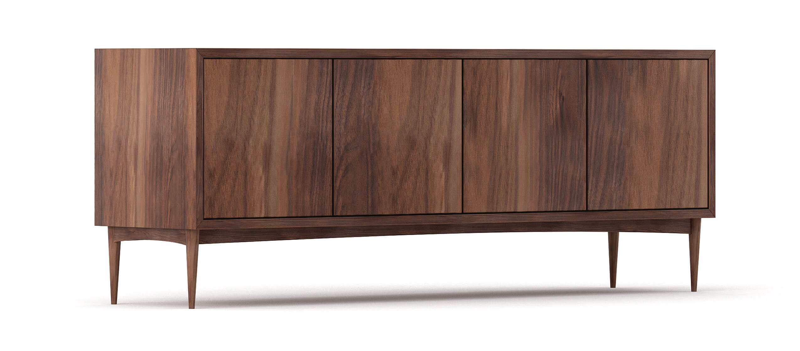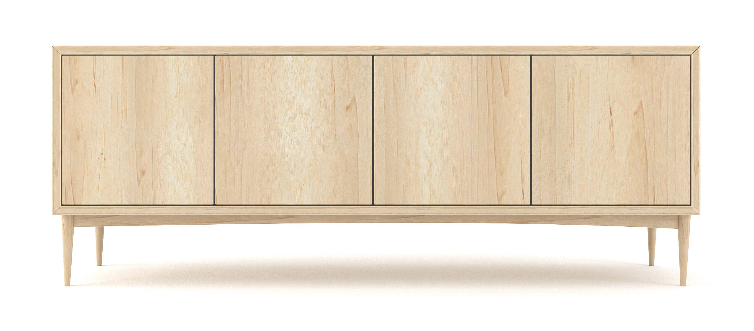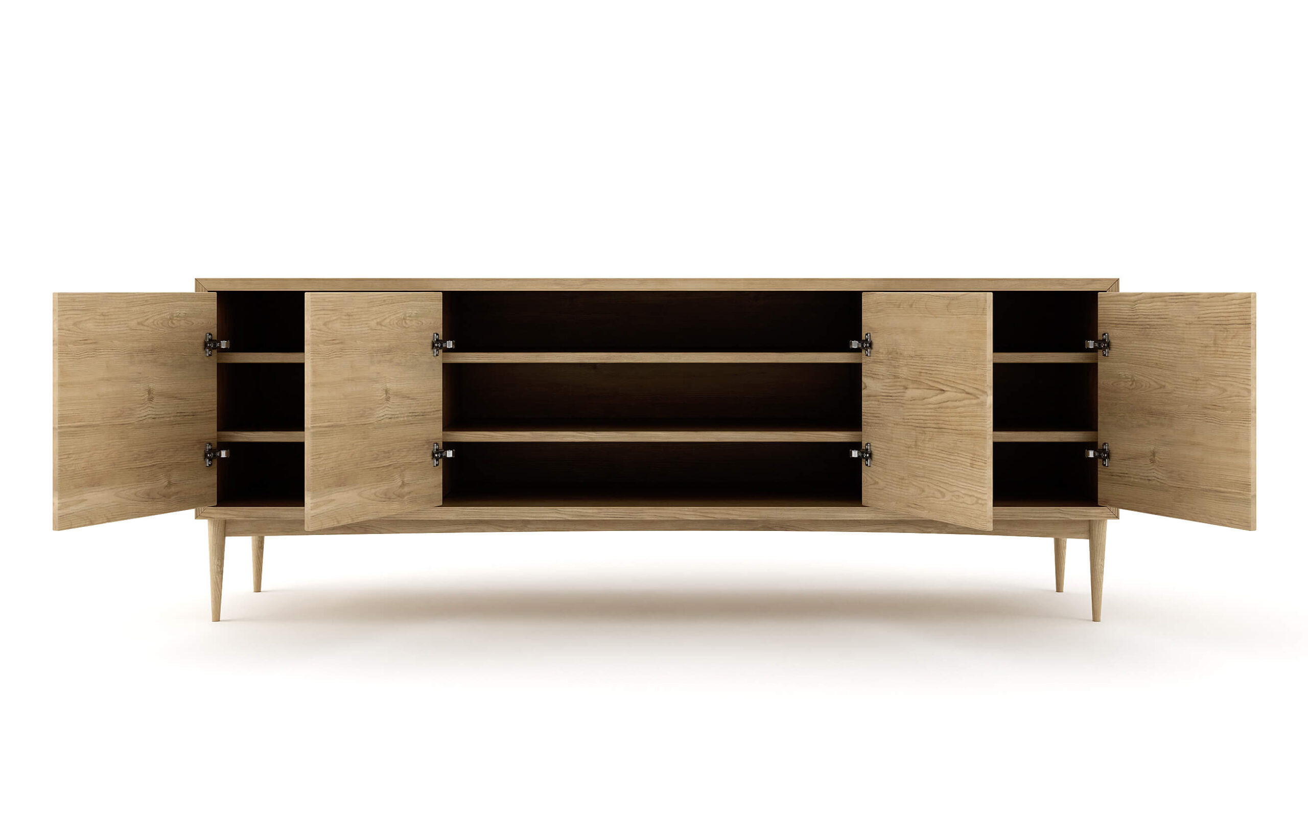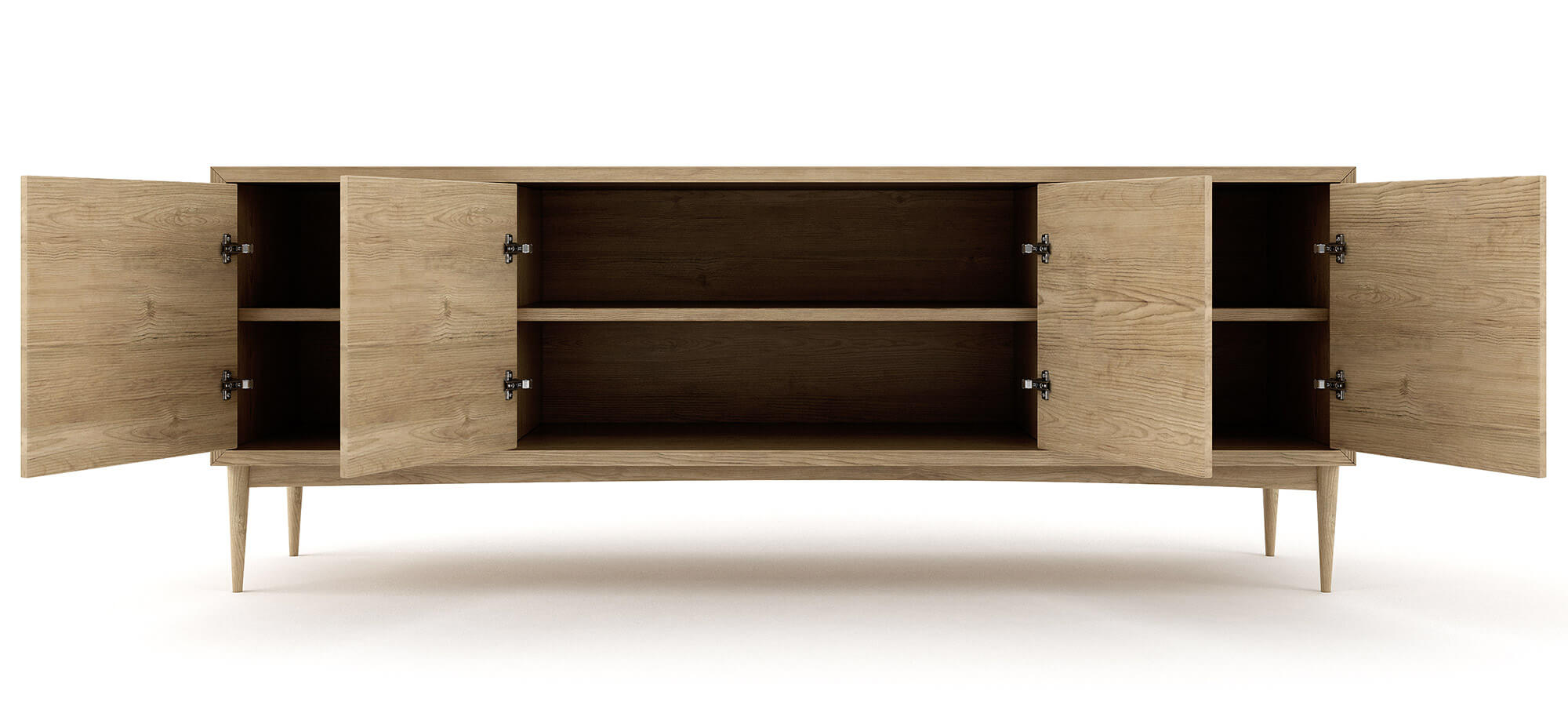 Gorgeous hardwoods. detailed joinery. and a gentle touch and push closure make the modern 4-Door Credenza an heirloom piece. Enjoy plenty of space and adjustable shelving on the ends for easy organizing: use as a sideboard to store dinnerware. or style it up with your record player and framed art in the living room. Also available in 2 and 3-door versions.