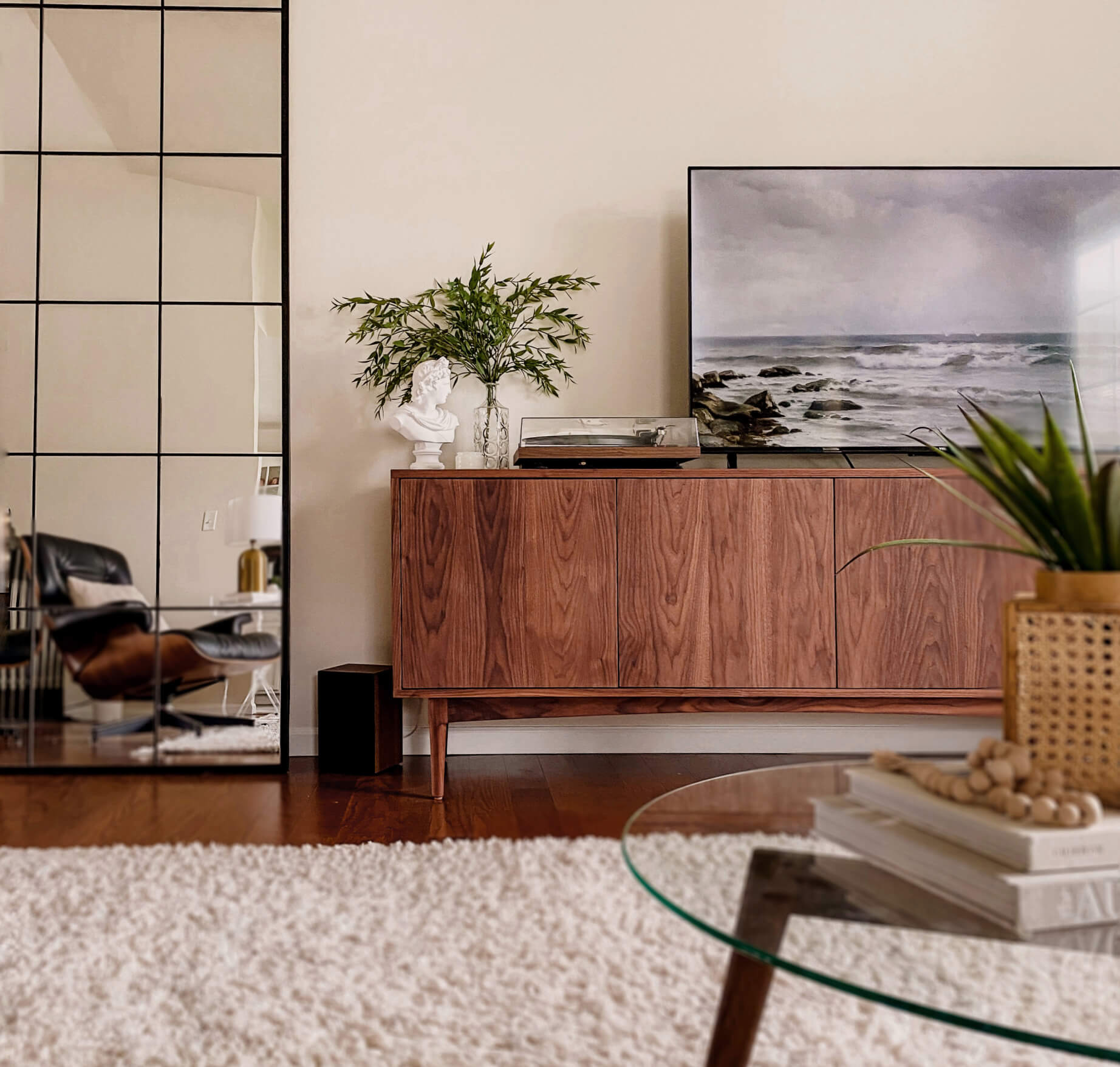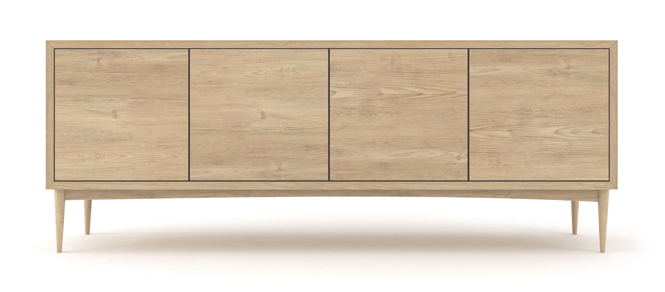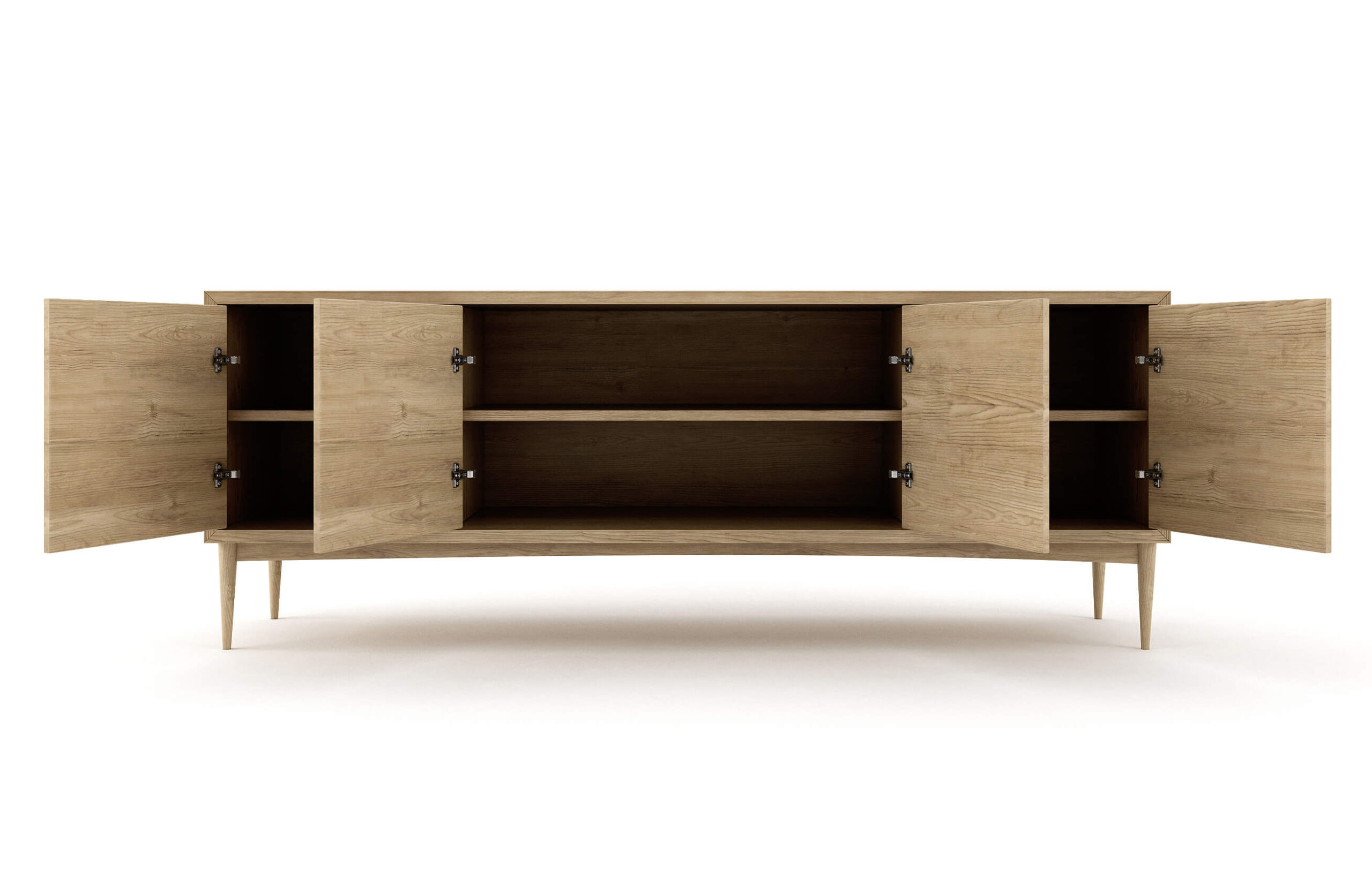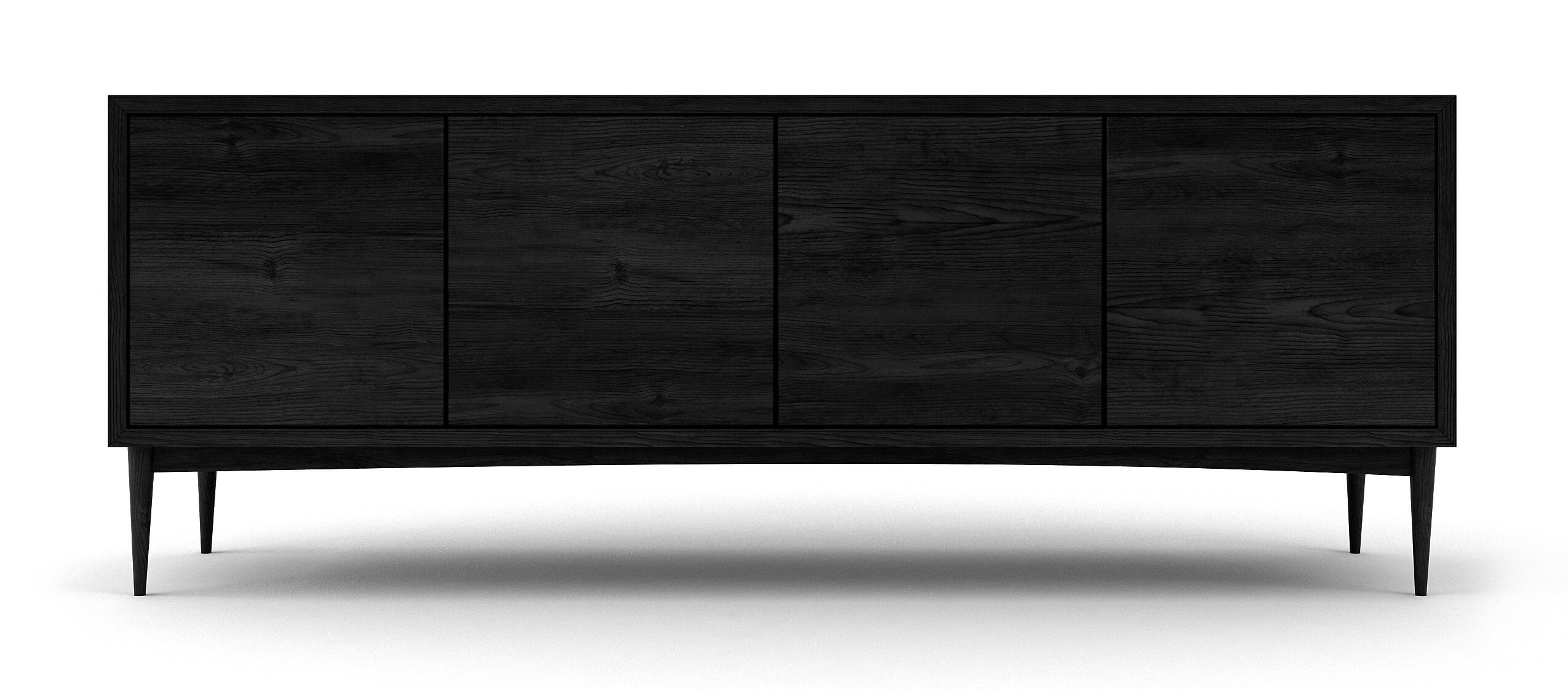 Gorgeous hardwoods. detailed joinery. and a gentle touch and push closure make the modern 4-Door Credenza an heirloom piece. Enjoy plenty of space and adjustable shelving on the ends for easy organizing: use as a sideboard to store dinnerware. or style it up with your record player and framed art in the living room. Also available in 2 and 3-door versions.
